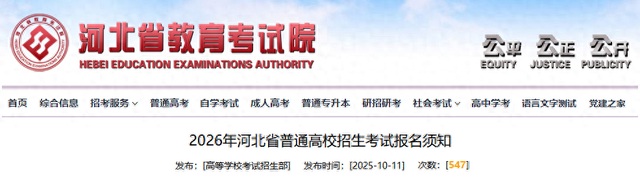 近日,我院发布了《关于做好2026年普通高校招生报名工作的通知》,2026年河北省普通高校招生考试报名工作将于2025年10月28日至11月11日进行。为使考生进一步了解2026年河北省普通高校招生考试(包括全国统考、省级统考和高校单独组织的招生考试,以下简称高考)报名有关政策,现对报名办法解读如下: