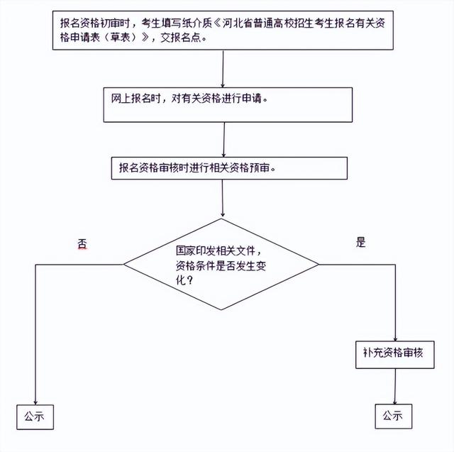 为便于高校招生各项工作的统筹推进,对三个专项计划和免费医学生计划的资格审核,我省采取集中预审核办法。即考生须在报名期间提交相关申请(具体流程见下图),市、县两级招生考试机构按照上一年度有关规定进行预审核,逾期不再办理审核手续。流程如下: