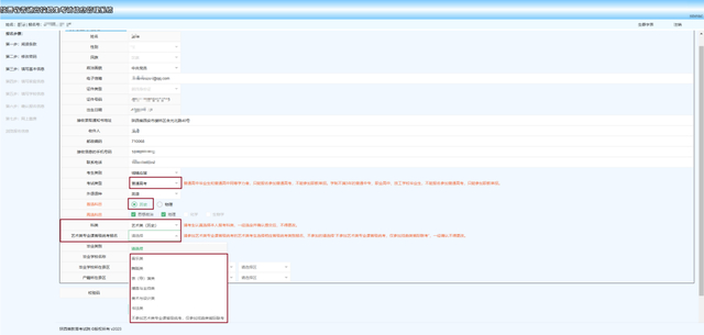 在高考报名同时还须完成艺术类专业课省级统考报名。报考我省艺术类专业课省级统考的考生请选择相应科类(招考类别、方向)。音乐类考生须选择招考类别(音乐教育、音乐表演可择一报考或者同时报考),音乐教育招考类别的考生还须选择主项(声乐或器乐二选一),音乐表演招考类别的考生还须选择方向(声乐或器乐二选一);舞蹈类考生还须选择舞种(中国舞、芭蕾舞、现代舞、国际标准舞、流行舞五选一);表(导)演类考生还须选择方向(戏剧影视表演、服装表演、戏剧影视导演三选一);不参加的请选择“不参加艺术类专业课省级统考,仅参加戏曲类省际联考”。