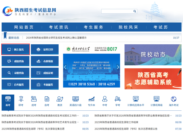 2026年陕西高考网上报名将于2025年11月1日开始,具体报名时间:2025年11月1日09:00至7日17:00,报考者可登录陕西省教育考试院门户网站(网址:https://www.sneea.cn)或陕西招生考试信息网(网址:https://www.sneac.com)进入“网上报名-2026年陕西省高考报名(普通高考和职教单招)”栏目完成网上报名流程,逾期未报名者责任自负。