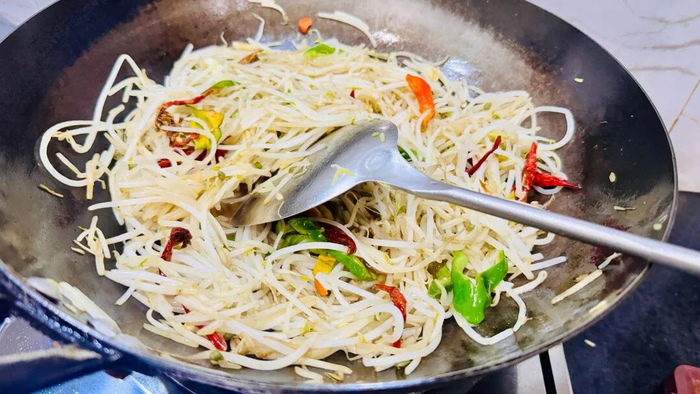 买了点绿豆芽,我本人是一直不太喜欢吃豆芽的,所以如果不是宝爸在家吃饭我一般都不会买的,孩子也不爱吃,不管是黄豆芽还是绿豆芽她都说味道怪怪的。起油锅,爆香姜蒜倒入豆芽翻炒至断生,加青红椒,我还加了点生抽,所以颜色深了点,最后加盐提味就可以出锅了。