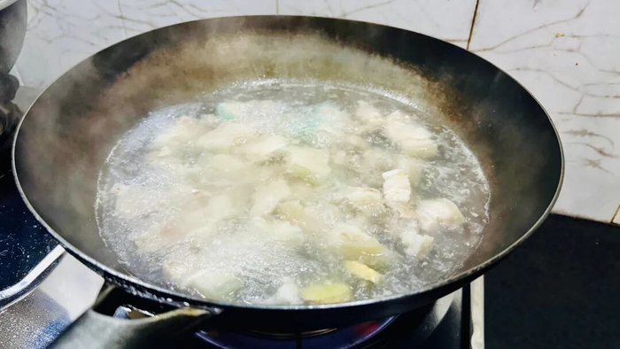 五花肉瘦成小块,加姜片,料酒焯一下水,焯好水之后再洗干净备用。