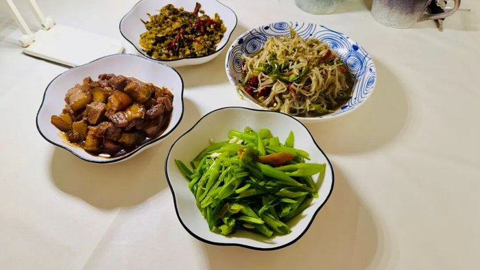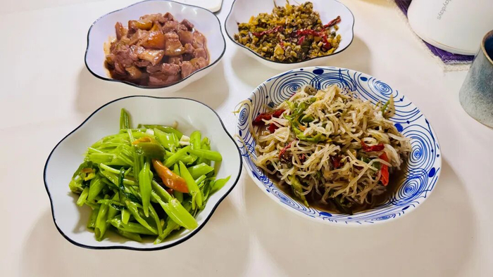 下雨买菜不方便,路边卖菜的也少了。看到有位奶奶再卖空心菜,买了点,其实已经不太嫩了,但觉得下雨天都不容易就买了点吧,平时叶子我都用来烧汤,但这次叶子有点老了,也不好看,直接丢掉了。起油锅,倒入空心菜,加入蒜泥炒出香味,加点辣椒炒均匀之后加盐提味就可以出锅了。