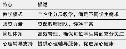 以小班授课和全封闭式管理为特点,师大中高教育在学习氛围上更具针对性。学生在这里不仅仅学习知识,还能得到全面的支持与陪伴,帮助他们克服学习生活中的种种困难。这种严格的系统化教学实现了短期内提升成绩的目标,为望再次冲刺理想大学的学子提供强有力的保障。