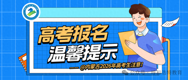 内蒙古自治区2026年普通高等学校招生网上报名(简称高考报名)工作定于2025年10月20日至10月31日进行。具体报名办法及相关要求届时将通过内蒙古招生考试信息网(https://www.nm.zsks.cn/)和内蒙古招生考试微信公众号(nmgjyksy)等官方媒体公布,请广大考生和家长及时关注。为方便广大考生提前做好相关准备,自治区教育考试院提醒如下。