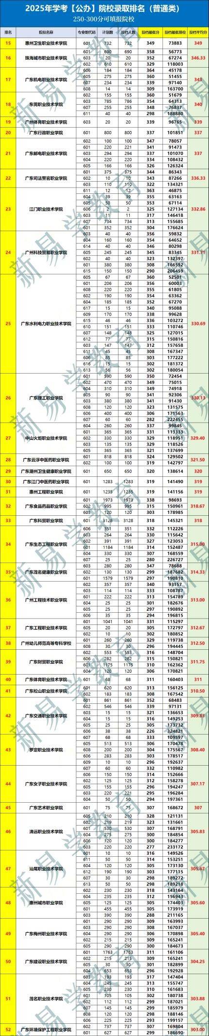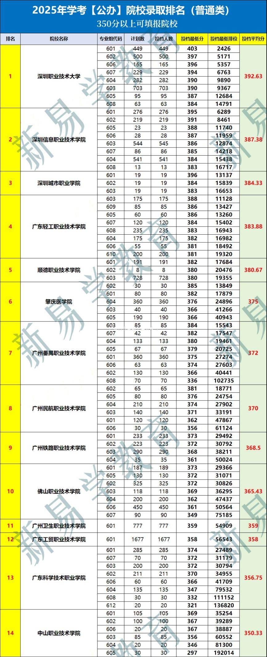 2025年公办录取难度排行榜的前5名:深圳职业技术大学、深圳信息职业技术学院、深圳城市职业学院、广东轻工职业技术大学、顺德职业技术学院,各专业组最低分380!
