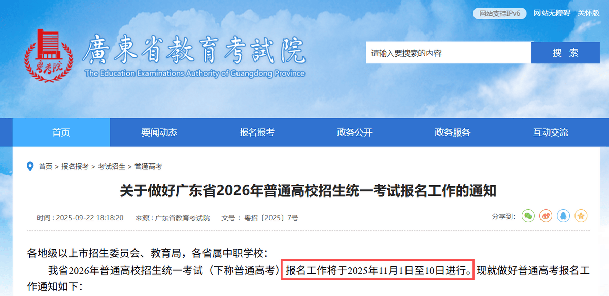 据广东省教育考试院官网发布的《关于做好广东省2026年普通高校招生统一考试报名工作的通知》,2026年高考报名将于11月1日-10日报名,时间与往年一致。